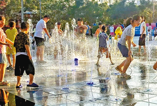 时值盛夏,在市区风光路与交通路交叉口附近的小广场上,随着音乐喷泉起起伏伏,孩子们跳进喷泉中间戏水,享受喷泉带来的快乐。(驻马店日报记者 郭建光 摄)